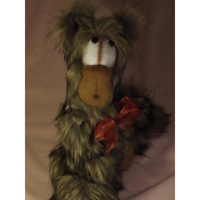Scamphas been made from long haired tipped brown faux fur and has been five way jointed with cotter pin joints for full poseability. The lower half of his face has been made from caramel brown felted material which has been needle sculpted to give him that cute expression. His eyes have been made from white felted material which has been shaded to give the impression of two eyes and he has two gorgeous black eyes for pupils. He looks like he has been up to something. His nose has been made from dark brown felted material which has then been stuffed and he has dark brown ear inserts created from caramel brown felted material.