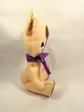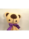A handmade bear by Billington Bears. He is completely hand sewn from 100% wool felt material and measures 7.5 inches long. Hand stitched using whip stitch so the stitches show and has his head sewn into place but does have his limbs string jointed so he can sit down. Marvin has black eyes and wears a purple bow.